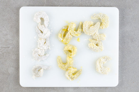 Die Garnelen mit etwas Küchenkrepp trocken tupfen und leicht salzen. 1 Ei verquirlen und die Garnelen zuerst in 1–2EL Mehl wenden, dann durch das Ei ziehen und anschließend in den Kokosraspeln wälzen.
