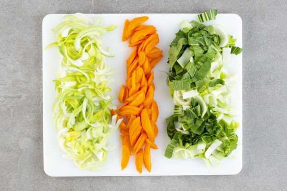 Den Strunk des Pak Choi dünn abschneiden und den Pak Choi in ca. 1cm breite Streifen schneiden. Die Karotten schälen, längs halbieren und schräg in dünne Scheiben schneiden. Den Lauch ebenfalls längs halbieren und schräg in dünne Streifen schneiden.