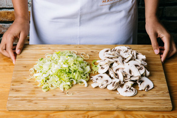 Den Lauch längs halbieren und in feine Streifen schneiden. Die Champignons ggf. mit etwas Küchenkrepp oder einer Bürste säubern und in dünne Scheiben schneiden.