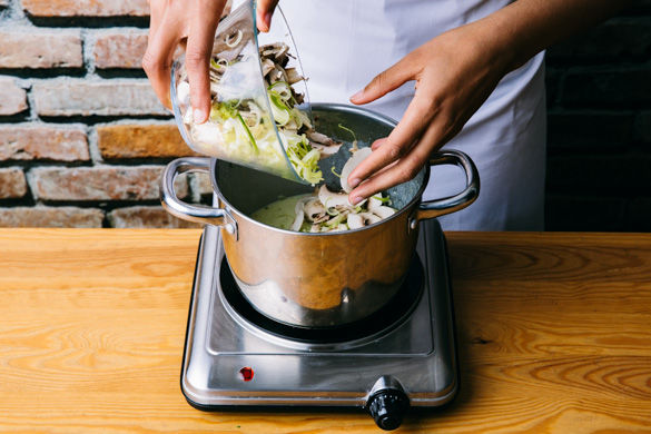 Den Lauch und die Pilze in den Topf geben, die Milch angießen und alles 5–6Min. cremig einköcheln lassen. Die Sauce mit Salz und Pfeffer abschmecken.