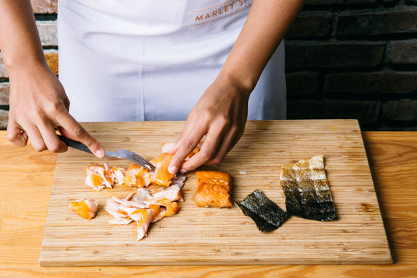 Den Lachs ggf. mit einem scharfen Messer von der Haut befreien und mit einer Gabel in kleine Stücke zerteilen. Evtl. vorhandene Gräten mit einer Pinzette entfernen.