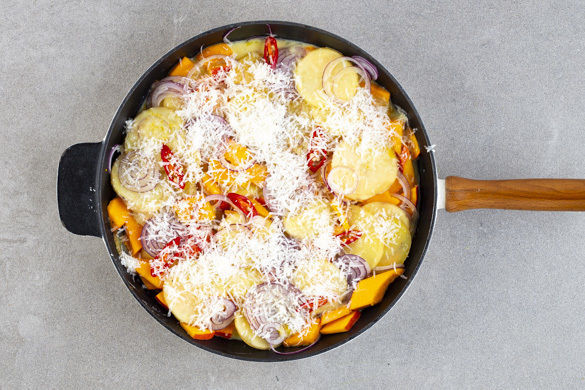 Mit dieser herbstlichen Kürbis-Kartoffel-Tortilla begeben wir uns auf eine kulinarische Reise nach Spanien! Unser Lieblingskürbis – ihr wisst schon: der, der nicht geschält werden muss! – verleiht dem spanischen Klassiker eine leicht süßliche Note, die fein mit der milden Peperoni und dem würzigen Hartkäse harmoniert.