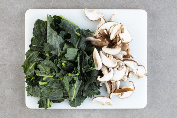 Die 1/2 des Schwarzkohls ggf. verlesen, von harten Stängeln befreien und in mundgerechte Stücke zupfen. Tipp: Wer mag, kann auch den gesamten Schwarzkohl verwenden. Die Pilze ggf. mit etwas Küchenkrepp oder einer Bürste säubern und in dünne Scheiben schneiden, die Stiele entfernen.