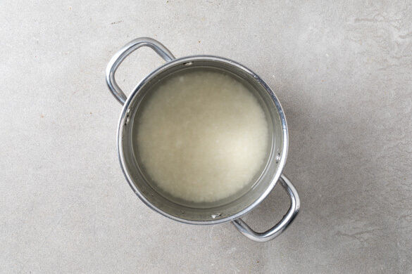 Inzwischen den Reis in einem Sieb kalt abspülen, bis das Wasser klar bleibt. Sobald das Wasser kocht, den Reis hineingeben und abgedeckt bei niedrigster Hitze 18–20Min. kochen, bis das Wasser aufgesogen und der Reis gar ist. Noch ca. 5Min. ohne Hitzezufuhr ziehen lassen.