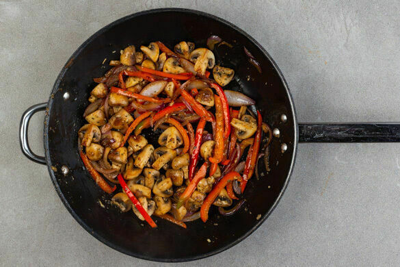 Die Zwiebeln, den Knoblauch, die Paprika, die Pilze und die Gewürzmischung in derselben Pfanne mit 1EL Olivenöl und 1TL Salz bei mittlerer Hitze unter gelegentlichem Rühren 5–6Min. anbraten. Tipp: Je nach Größe der Pfanne ggf. eine zweite Pfanne verwenden.