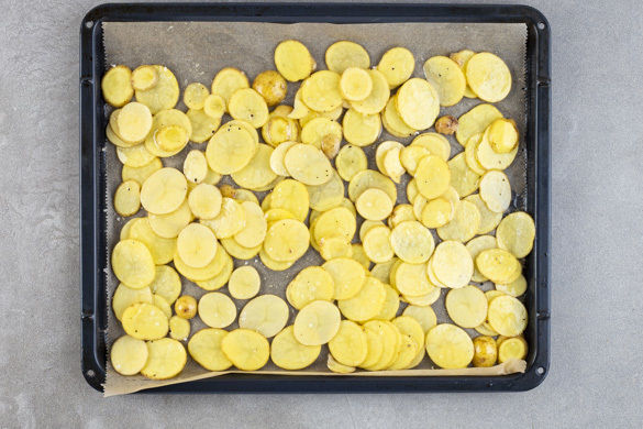 Die Kartoffeln samt Schale in max. 0,5cm dünne Scheiben schneiden und auf einem mit Backpapier ausgelegten Backblech mit 1EL Pflanzenöl beträufeln und 1 Prise Salz vermengen. Gleichmäßig verteilen und 15–20Min. im Ofen rösten. In einem mittelgroßen Topf ausreichend gesalzenes Wasser für das Gemüse zum Kochen bringen.