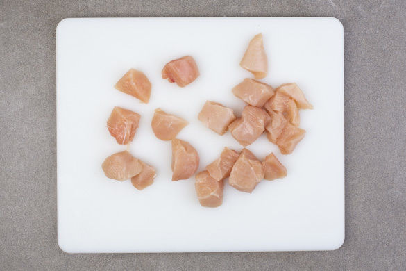 Das Fleisch mit etwas Küchenkrepp trocken tupfen und in 1–2cm kleine Würfel schneiden.