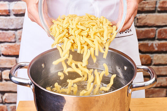 Die Pasta in das kochende Wasser geben und in 6–8Min. bissfest garen. Mit einem Messbecher ca. 250ml Pastawasser abschöpfen, dann die Pasta in ein Sieb abgießen und abtropfen lassen.