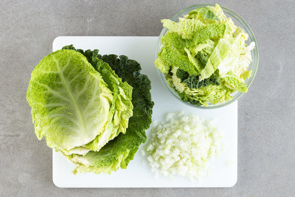 In einem großen Topf ausreichend gesalzenes Wasser für das Blanchieren der Wirsingblätter zum Kochen bringen. Ggf. unschöne Wirsingblätter entfernen und mindestens 8 unbeschädigte Blätter abzupfen und beiseitelegen. Den restlichen Wirsing in 1–2cm breite Streifen schneiden. Die Zwiebel schälen, halbieren und fein würfeln. Die Petersilie samt Stängeln fein hacken.
