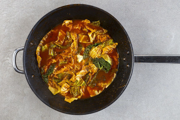 Die Rouladen in einer mittelgroßen Pfanne mit 1–2EL Olivenöl bei mittlerer Hitze 2–3Min. rundum anbraten. Mit 1/2EL Mehl bestäuben, das Tomatenmark unterrühren und mit der Brühe ablöschen, dann die Wirsingstreifen dazugeben und die Rouladen abgedeckt 10–15Min. sanft köcheln lassen, dabei ab und zu wenden.