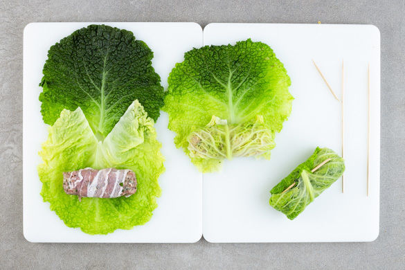 Je 2 Wirsingblätter doppelt übereinander auslegen. Das Hackfleisch mit den Zwiebeln, 2/3 der Petersilie und dem Senf verkneten. Kräftig mit Salz und Pfeffer würzen, in 4 gleich große, längliche Frikadellen formen und mit den Baconscheiben umwickeln. Auf die vorbereiteten Kohlblätter geben, die Seiten einklappen und fest einrollen. Mit den Holzspießen fixieren.