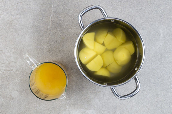 Die Kartoffeln schälen und je nach Größe halbieren oder vierteln. In einem mittelgroßen Topf mit ausreichend gesalzenem Wasser aufkochen und in ca. 15Min. gar kochen. In ein Sieb abgießen, zurück in den Topf geben und warm halten. Das Brühgewürz in 600ml heißem Wasser auflösen.