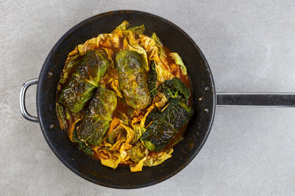 Die Rouladen in einer großen Pfanne mit 2–3EL Olivenöl bei mittlerer Hitze 2–3Min. rundum anbraten. Mit 1EL Mehl bestäuben, das Tomatenmark unterrühren und mit der Brühe ablöschen, dann die Wirsingstreifen dazugeben und die Rouladen abgedeckt 10–15Min. sanft köcheln lassen, dabei ab und zu wenden.