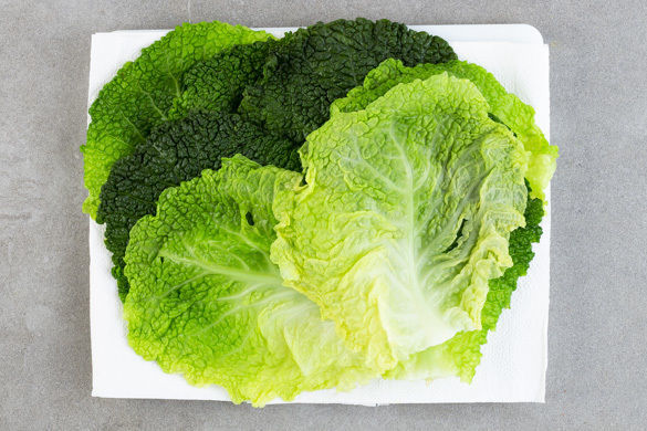 Zum Abschrecken der Wirsingblätter das Spülbecken mit möglichst kaltem Wasser füllen. Die Wirsingblätter in das kochende Salzwasser geben und 1–2Min. blanchieren, dabei je nach Größe in 4–5 Durchgängen arbeiten. Die Wirsingblätter mit einer Schaumkelle zum Abschrecken in das kalte Wasser legen und anschließend z. B. mit einem Küchentuch möglichst gut trocknen.