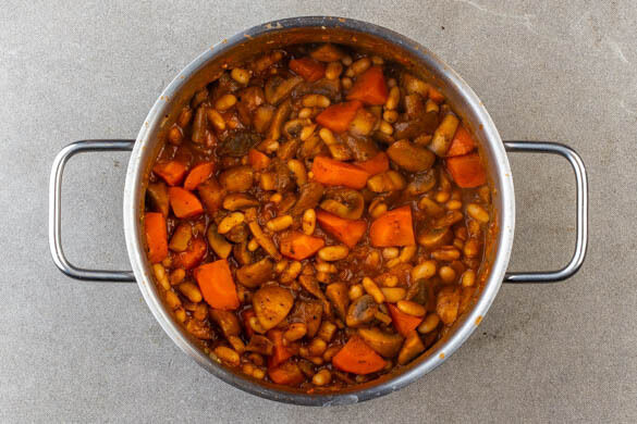Die Bohnen, 700ml Wasser, das Brühgewürz und 1 kräftige Prise Pfeffer zugeben. Den Eintopf einmal aufkochen lassen, dann abgedeckt 12–15Min. unter gelegentlichem Rühren sanft köcheln lassen, bis eine sämige Sauce entsteht.