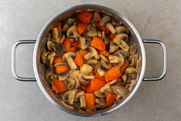 Die Karotte ggf. schälen und in ca. 2cm große Würfel schneiden. Die Schalotte schälen, halbieren und in ca. 0,5cm breite Streifen schneiden. Die Karotten und die Schalotten in einem mittelgroßen Topf mit 1½EL veganer Butter und je 1 Prise Salz und Pfeffer bei mittlerer Hitze unter gelegentlichem Rühren ca. 5Min. anbraten.
