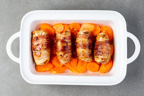 Die Involtini mit je 1 Prise Salz und Pfeffer würzen und in einer großen Pfanne mit 2EL Olivenöl bei mittlerer Hitze rundum 2–3Min. anbraten. Die Karotten und den Knoblauch in einer Auflaufform verteilen, die Involtini auf das Gemüse legen und alles 8–10Min. im Ofen backen, bis das Fleisch gar ist.