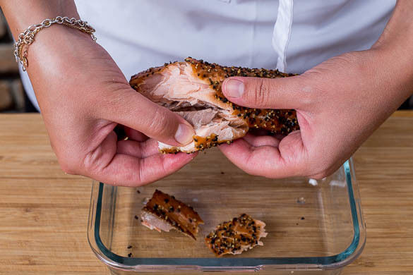 Den Räucherlachs in mundgerechte Stücke zupfen und in eine Auflaufform geben. Mit ein paar Tropfen Wasser besprenkeln und im Ofen 3–5Min. erwärmen. Die Lauchzwiebel in feine Ringe schneiden.