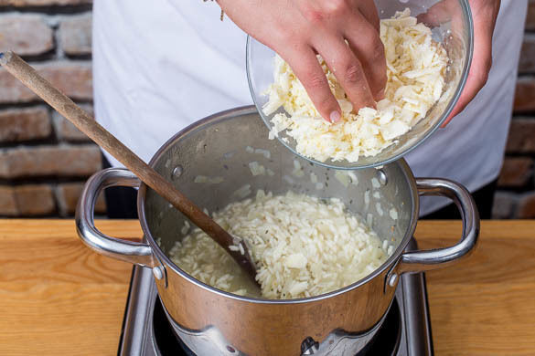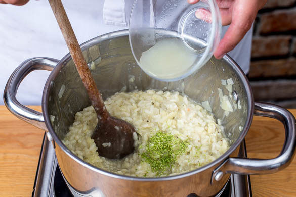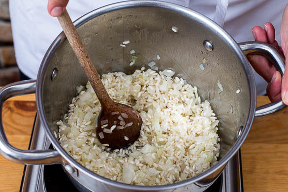 Die Zwiebeln und den Reis in einem mittelgroßen Topf mit 1–2EL Olivenöl und 1 Prise Salz bei mittlerer Hitze 2–3Min. glasig anschwitzen.