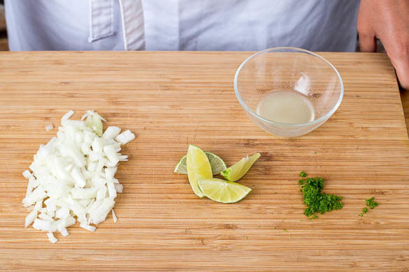 Den Backofen auf 150°C Umluft (170°C Ober-/Unterhitze) vorheizen. Die Zwiebel schälen, halbieren und in feine Würfel schneiden. Die Limettenschale abreiben und die Limette halbieren, eine Hälfte auspressen, die andere Hälfte in Spalten schneiden. Das Brühgewürz in 1L heißem Wasser auflösen.