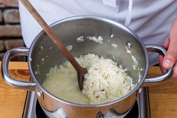 Die Zwiebeln und den Reis in einem großen Topf mit 2–3EL Olivenöl und 1 Prise Salz bei mittlerer Hitze 2–3Min. glasig anschwitzen.