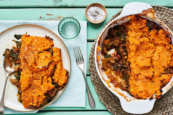 Die Linsen-Gemüse-Sauce in eine Auflaufform geben und mit dem Süßkartoffelpüree bedecken. Auf einer der oberen Schienen 6–8Min. im Ofen überbacken und sofort servieren.