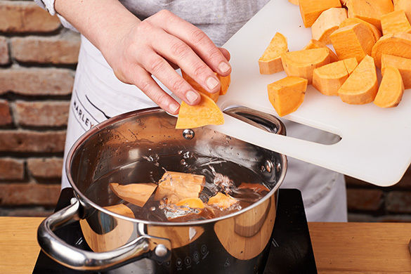 Den Backofen mit Grillfunktion auf 220°C vorheizen. Die Süßkartoffeln schälen und in 2–3cm große Stücke schneiden. In einem mittelgroßen Topf mit Salzwasser bedeckt zum Kochen bringen und anschließend leicht köchelnd in 10–15Min. weich kochen. Mit einer Tasse etwas Kochwasser abschöpfen, dann in ein Sieb abgießen.