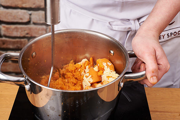 Die Süßkartoffeln mit einem Kartoffelstampfer zu einem cremigen Püree stampfen. Wer mag, kann dabei etwas Kochwasser hinzugeben. Den Käse unterrühren und das Püree mit Salz und Pfeffer abschmecken. Tipp: Wer mag, kann das Püree mit 1–2EL Butter verfeinern.