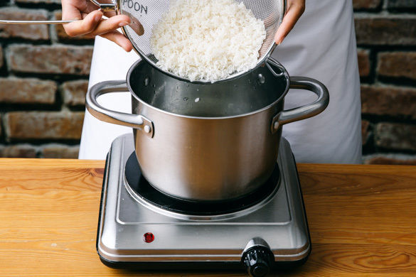 In einem mittelgroßen Topf 400ml leicht gesalzenes Wasser zum Kochen bringen. Den Reis in einem Sieb unter fließendem Wasser abspülen, bis das Wasser klar bleibt. Sobald das Wasser kocht, den Reis hineingeben und abgedeckt bei niedrigster Hitze 10–12Min. kochen, bis das Wasser aufgesogen und der Reis gar ist. Noch ca. 5Min. ohne Hitzezufuhr ziehen lassen.