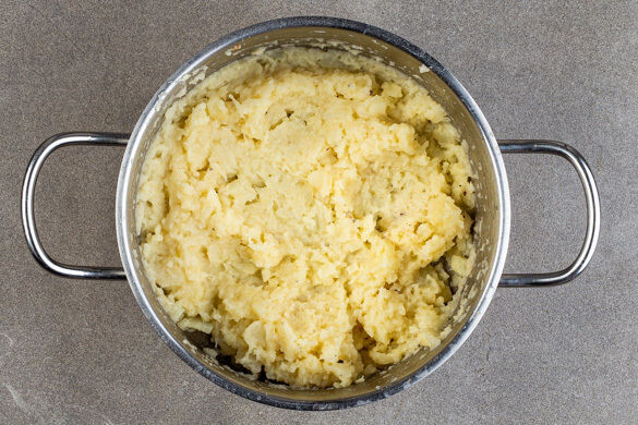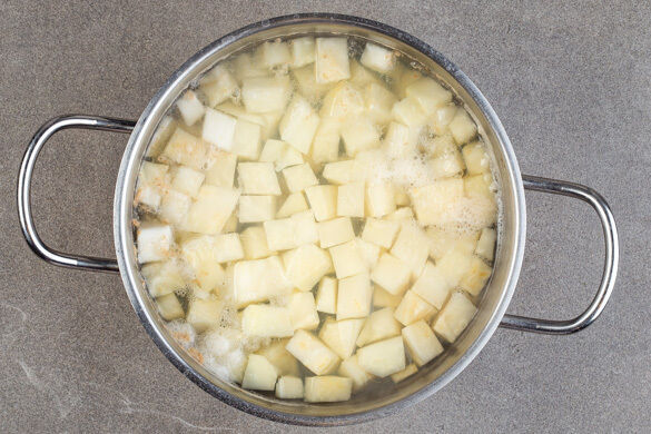 In einem Wasserkocher 1,7L Wasser aufkochen. Den Sellerie vierteln, mit einem Messer schälen und in 1–2cm große Stücke schneiden. In einem großen Topf mit dem kochenden Wasser bedecken und ½TL Salz hinzugeben. Tipp: Ggf. mehr Wasser nachkochen, der Sellerie sollte vollständig bedeckt sein. Das Wasser erneut zum Kochen bringen und den Sellerie abgedeckt in ca. 15Min. weich kochen.