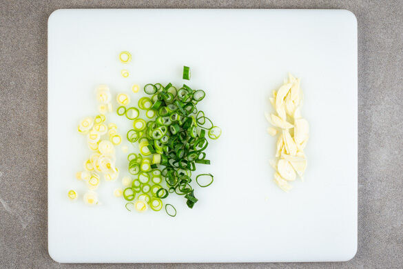 Die Lauchzwiebeln in dünne Ringe schneiden, den weißen und grünen Teil separat aufbewahren. Den Knoblauch schälen und in hauchdünne Scheibchen schneiden.