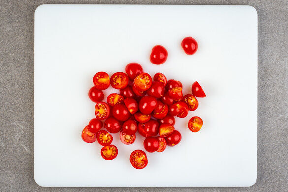Die weißen Lauchzwiebelringe und den Knoblauch in einer mittelgroßen Pfanne mit 1EL Butter bei mittlerer Hitze 1–2Min. farblos anbraten. Die Kirschtomaten dazugeben und durchschwenken, dann das Tomatenmark unterrühren. Mit 200ml Wasser ablöschen und die Sauce ca. 2Min. sanft köcheln lassen. Mit 1TL Honig sowie Salz und Pfeffer nach Geschmack würzen.