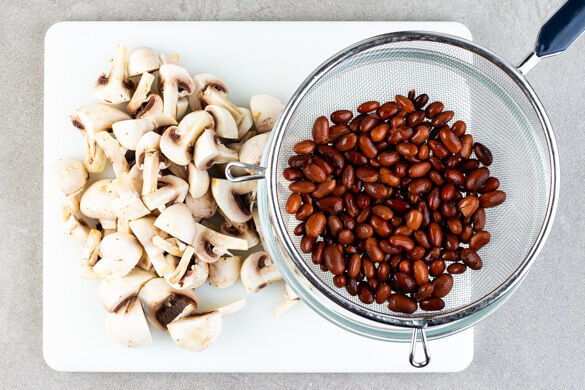 Den Backofen auf 220°C (200°C Umluft) vorheizen. Die Pilze ggf. säubern und vierteln. Die Bohnen in einem Sieb mit kaltem Wasser abspülen und abtropfen lassen. Die Karotte ggf. schälen und in dünne Scheiben schneiden.