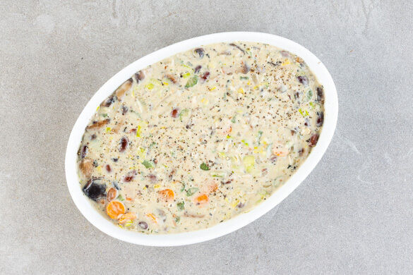Die Hefeflocken unterrühren. Die Gemüse-Bohnen-Füllung mit Salz und Pfeffer abschmecken und in eine Auflaufform geben.