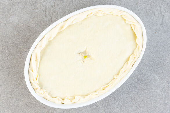 Die Gemüse-Bohnen-Füllung mit dem Teig abdecken. Überstehenden Teig abschneiden, in Streifen schneiden und verdrehen, dann am Rand entlang dekorativ auflegen, sodass alle evtl. vorhandenen Lücken geschlossen werden. In der Mitte kreuzweise einschneiden, damit der Dampf entweichen kann.