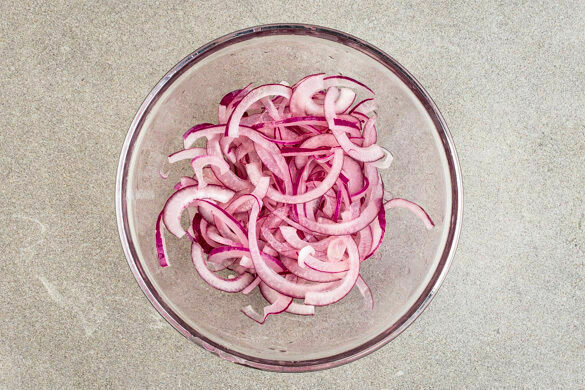 Die Zwiebel schälen, halbieren und in feine Streifen schneiden, dann mit 2EL Essig, ½TL Salz sowie 1EL Wasser vermengen und beiseitestellen.