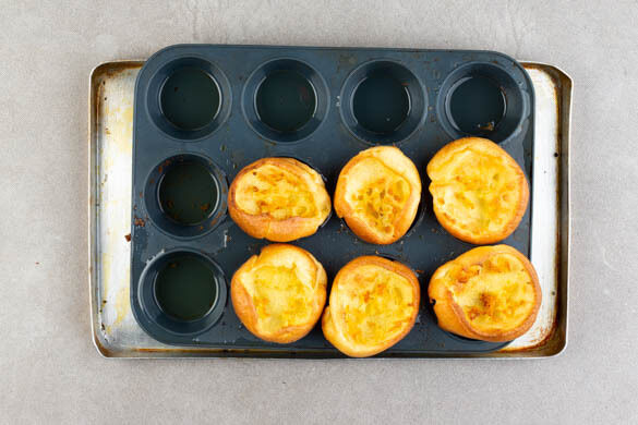 Das Blech mit der Muffin-Backform vorsichtig aus dem Ofen nehmen und die 6 vorbereiteten Mulden jeweils etwa zur Hälfte bzw. bis zu zwei Dritteln mit dem Teig befüllen. Auf der untersten Schiene 20–25Min. backen, bis die Yorkshirepuddings aufgegangen, goldbraun und in der Mitte nicht mehr feucht sind.