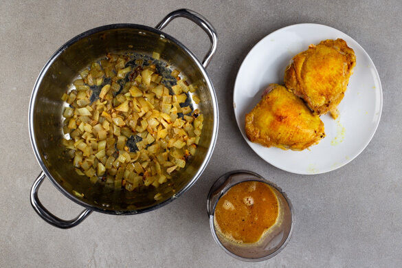 Das Fleisch in demselben Topf mit 2EL Butter bei mittlerer Hitze 2–3Min. auf jeder Seite goldbraun anbraten und herausnehmen. Die Zwiebeln mit 1TL Zucker in den Topf geben und 4–5Min. karamellisieren. Den Knoblauch und ¾ des Spekulatiusgewürzes zugeben und ca. 30Sek. mitbraten. Das Brühgewürz in 300ml heißem Wasser auflösen.