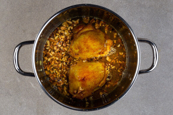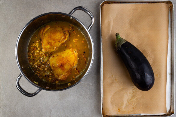 Die Walnüsse und die Brühe in den Topf geben und aufkochen, dann die Hitze reduzieren. Das Fleisch samt Bratensaft zugeben und bei niedriger Hitze ca. 1Std. köcheln lassen, dabei gelegentlich umrühren. Die Aubergine einige Male mit einem scharfen Messer leicht anritzen und auf einem mit Backpapier ausgelegten Backblech im Ofen 35–40Min. weich backen.