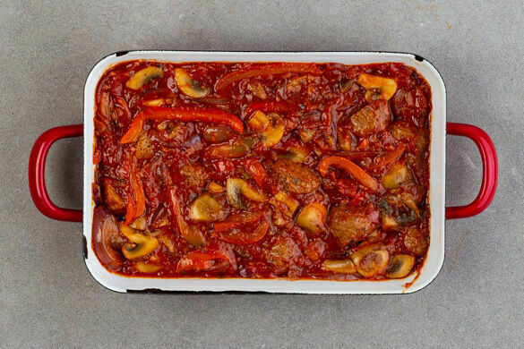 So ein schmackhaftes Ofengericht ist manchmal einfach genau das Richtige. Denn es wärmt ja nicht nur den Körper, sondern auch die Seele! Hier treffen einige unbestrittene Größen der Soulfood-Fraktion aufeinander und lassen etwas wahrlich Heißes entstehen: eine aromatische, mit provenzalischen Kräutern gewürzte Füllung aus Paprika, Pilzen und veganen Hackbällchen in Tomatensauce unter knusprigem Blätterteig! Halleluja!