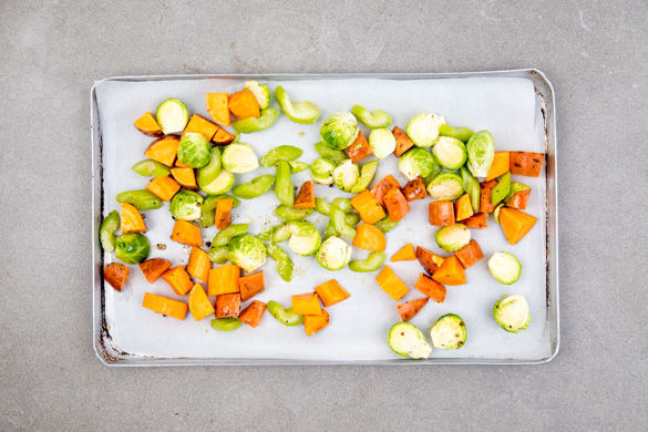 Die Süßkartoffeln, den Rosenkohl und den Sellerie auf ein mit Backpapier ausgelegtes Backblech geben, mit 1–2EL Olivenöl sowie Salz und Pfeffer vermengen und im Ofen 15–20Min. backen, bis die Süßkartoffeln an den Rändern knusprig sind.