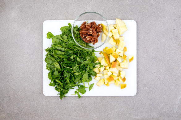Den Apfel vierteln, vom Kerngehäuse befreien und in ca. 2cm große Würfel schneiden. Den Spinat grob hacken. Die Pekannüsse in der Pfanne bei mittlerer Hitze ohne Zugabe von Fett ca. 1Min. anrösten. Vorsicht, die Nüsse können schnell verbrennen.