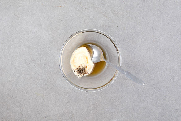 Die Mayonnaise, den Ahornsirup, 1–2EL Essig (am besten eignet sich Weißweinessig) und 1–2EL Wasser zu einem Dressing verrühren und mit Salz und Pfeffer abschmecken.