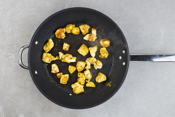 Das Fleisch mit etwas Küchenkrepp trocken tupfen, in ca. 2cm große Stücke schneiden und mit dem Currypulver vermengen.