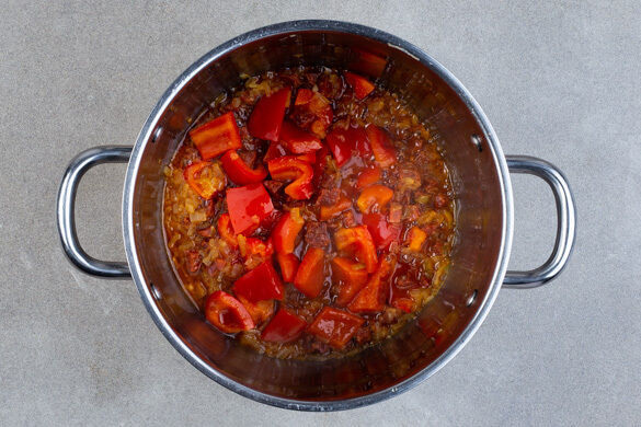 Die Paprika, die Zwiebeln, den Knoblauch und die Chorizo in einem mittelgroßen Topf mit 2TL Olivenöl bei mittlerer Hitze 2–3Min. anbraten, bis das Gemüse weich wird.
