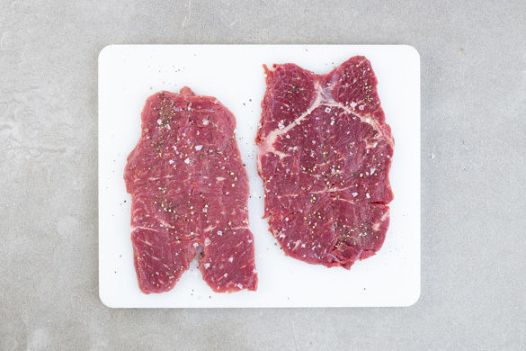 Das Fleisch trocken tupfen und mit einem Schmetterlingsschnitt quer halbieren, aber nicht durchschneiden. Zwischen Frischhaltefolie mit einem Fleischklopfer oder einer schweren Pfanne ca. 0,5cm dick plattieren und von beiden Seiten mit Salz und Pfeffer würzen.