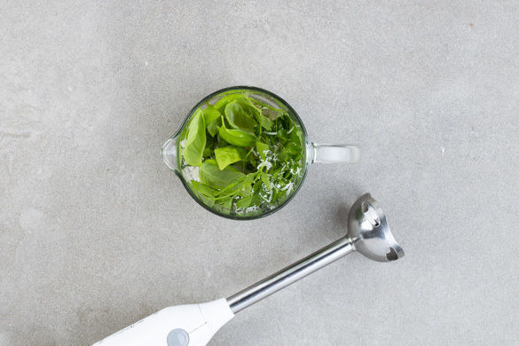Die Basilikumblätter abzupfen, einige Blätter für die Garnitur beiseitelegen. Den Käse fein reiben und mit dem Basilikum, der Petersilie samt Stängeln sowie 2EL Olivenöl mit einem Stabmixer in einem hohen Gefäß pürieren, dabei nach Bedarf ggf. 1–2EL Olivenöl oder Wasser hinzugebe. Das Pesto mit Salz abschmecken.