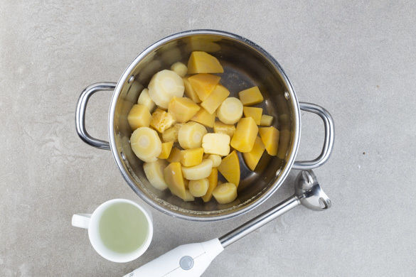 Den Backofen auf 160°C Umluft (180°C Ober-/Unterhitze) vorheizen. Die Steckrübe und die Petersilienwurzeln schälen, in 2–3cm große Stücke schneiden und in einem mittelgroßen Topf mit leicht gesalzenem Wasser bedeckt aufkochen. In 15–20Min. weich kochen. Die Walnüsse grob hacken und in einer großen Pfanne ohne Fett bei mittlerer Hitze 2–3Min. anrösten. Herausnehmen und beiseitestellen.
