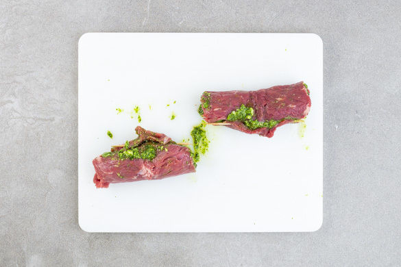 Das Fleisch gleichmäßig mit dem Pesto bestreichen, dabei etwas Pesto für die Garnitur aufbewahren. Das Fleisch zu Rouladen aufrollen und mit den Holzspießen fixieren.