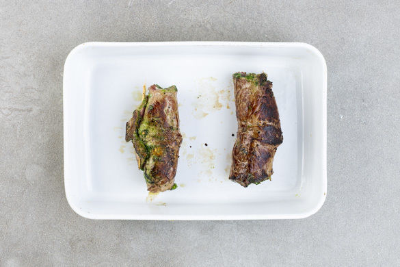Die Rouladen mit Salz und Pfeffer würzen und in der Pfanne mit 1–2EL Olivenöl bei starker Hitze ca. 2Min. von allen Seiten scharf anbraten. Anschließend in eine Auflaufform geben und im Ofen noch 8–12Min. weitergaren. Das Fleisch sollte in der Mitte noch rosa sein. Aus dem Ofen nehmen und 1–2Min. nachziehen lassen.